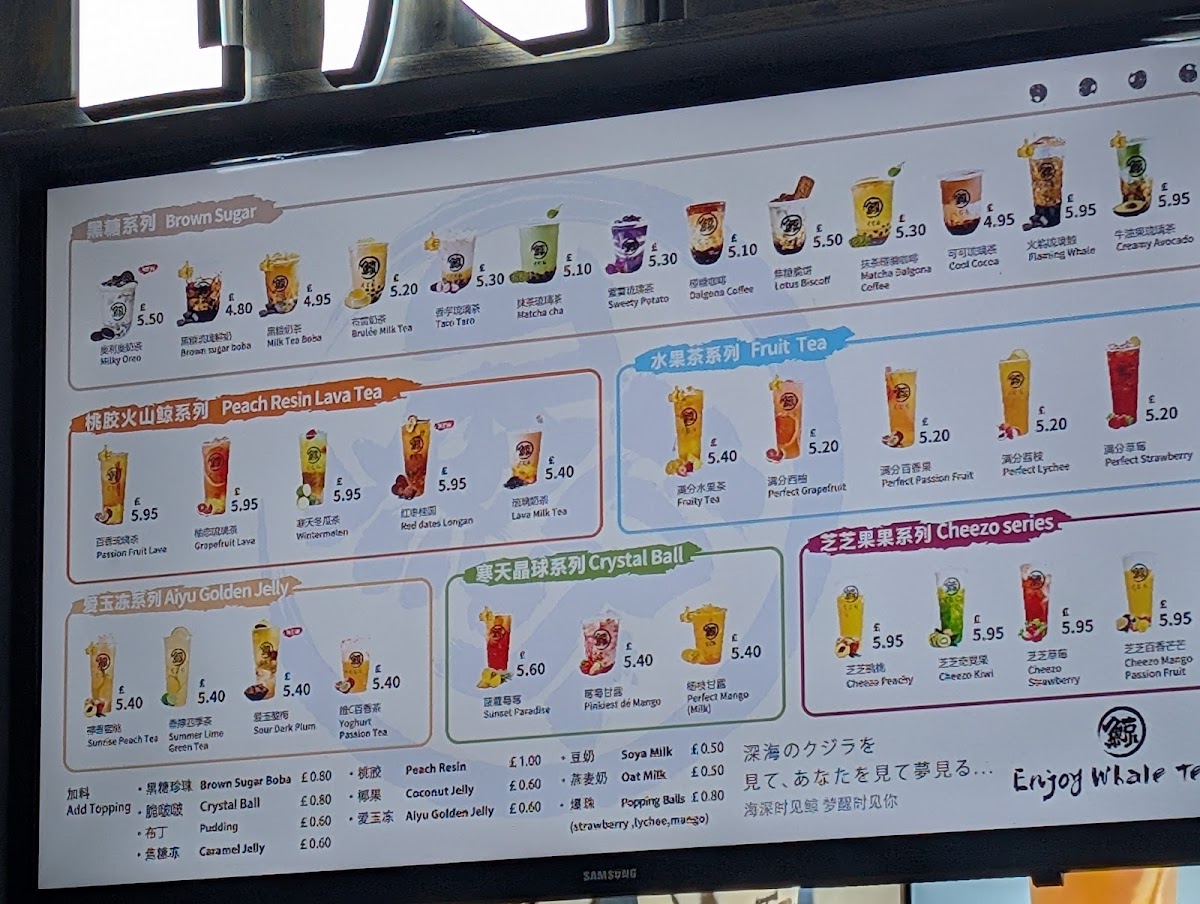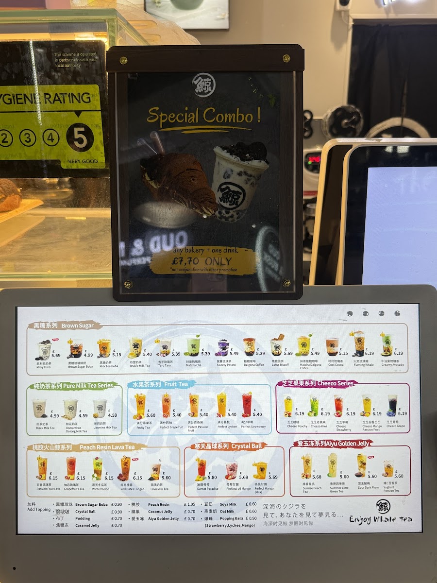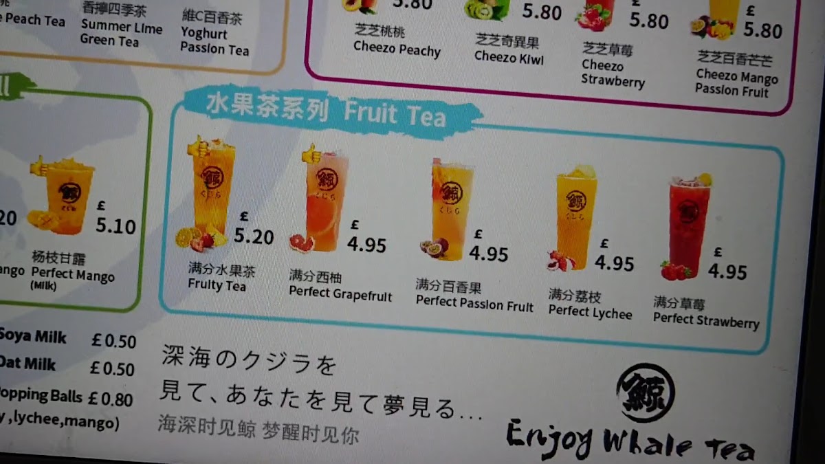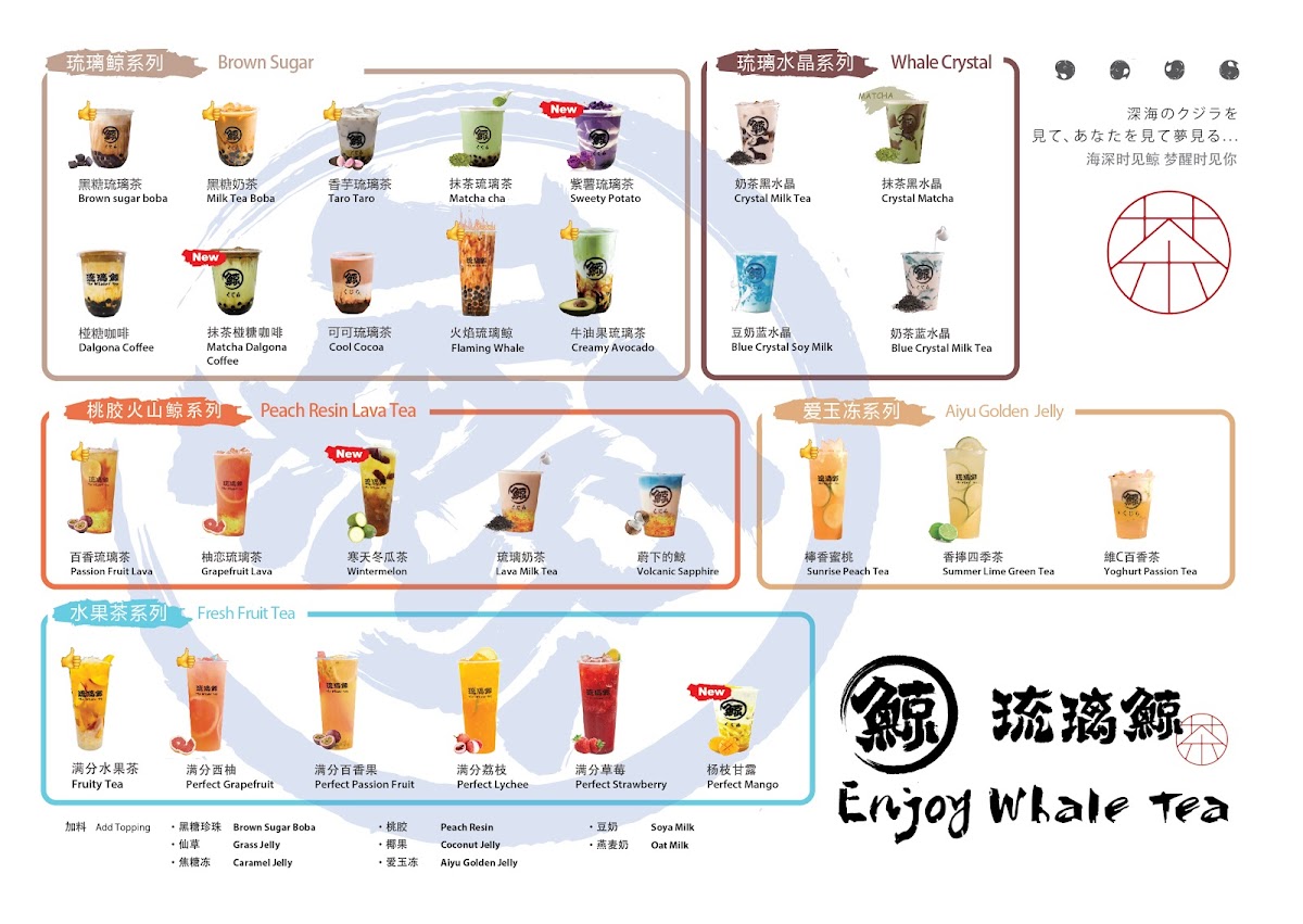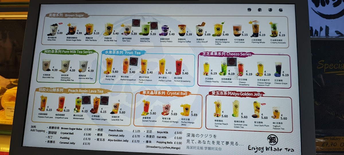 Overall, the menu at The Whale Tea Stratford offers a vibrant and diverse selection that leaves a lasting impression, especially with its appealing 40% off highlights like [1001] Brown Sugar Boba, [1003] Brulee Milk Tea, and [1011] Creamy Avocado. The Brown Sugar Boba range stands out with indulgent options such as [1002] Milk Tea Boba, [1009] Cool Cocoa, [1010] Flaming Whale, [1004] Taro Taro, and [1007] Dalgona Coffee, each delivering rich and satisfying flavors. For something lighter and refreshing, the Fruit Tea series features choices like [4001] Fruity Tea, [4002] Perfect Grapefruit, [4003] Perfect Passion Fruit, [4004] Perfect Lychee, and [4005] Perfect Strawberry, while the Aiyu Fruit Tea selection-including [5001] Sunrise Peach Tea, [5002] Summer Lime Green Tea, [5003] Yoghurt Passion Tea, and [5004] Sour Dark Plum-adds a tangy twist. The creative Peach Raisin Lava Tea line, with options like [2004] Lava Milk Tea, [2002] Grapefruit Lava, and [2001] Passion Fruit Lava, brings a unique texture and depth. Meanwhile, the visually appealing Crystal Ball drinks such as [6001] Sunset Paradise, [6004] Perfect Mango, and [6003] Pinkiest De Mango enhance the experience. The Cheezo Fruit Tea range, including [4103] Cheezo Mango Passion Fruit, [4104] Cheezo Strawberry, [4101] Cheezo Peachy, and [4102] Cheezo Kiwi, offers a creamy, savory contrast. Complementing the drinks are classic options from the Pure Milk Tea Series like Jasmine Milk Tea, Osmanthus Oolong Milk Tea, and Black Milk Tea, along with bakery treats such as Pineapple Bun, Melonpan, Taro Cheese Bun, Tuna Maple Bun, and Strawberry Ribbon Croissant, making the menu both well-rounded and satisfying.